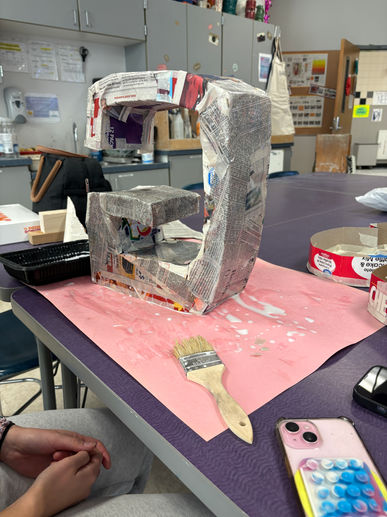 Unit Overview: Students experimented with a variety of fonts and themes to construct a three-dimensional letter sculpture before enhancing their design with a variety of mixed media materials to further illustrate their theme.